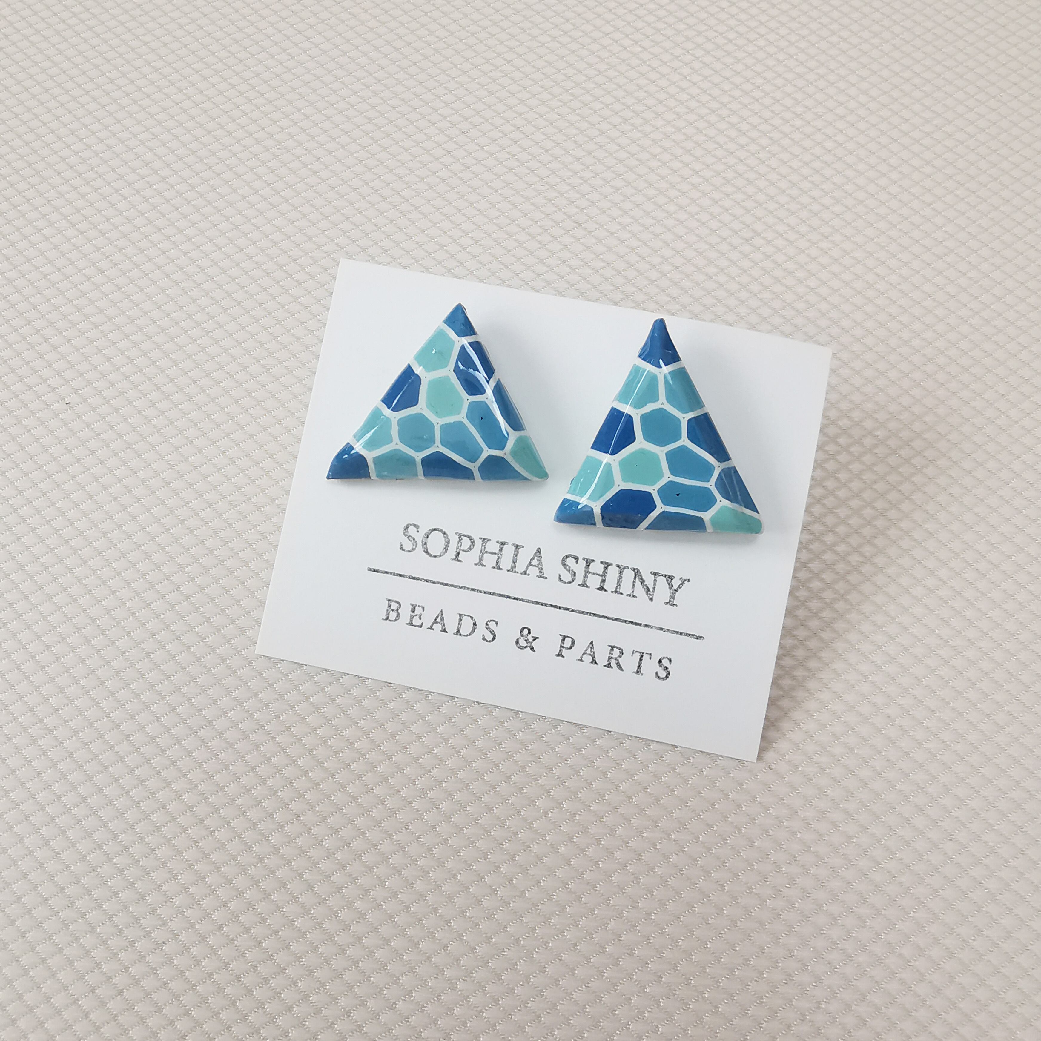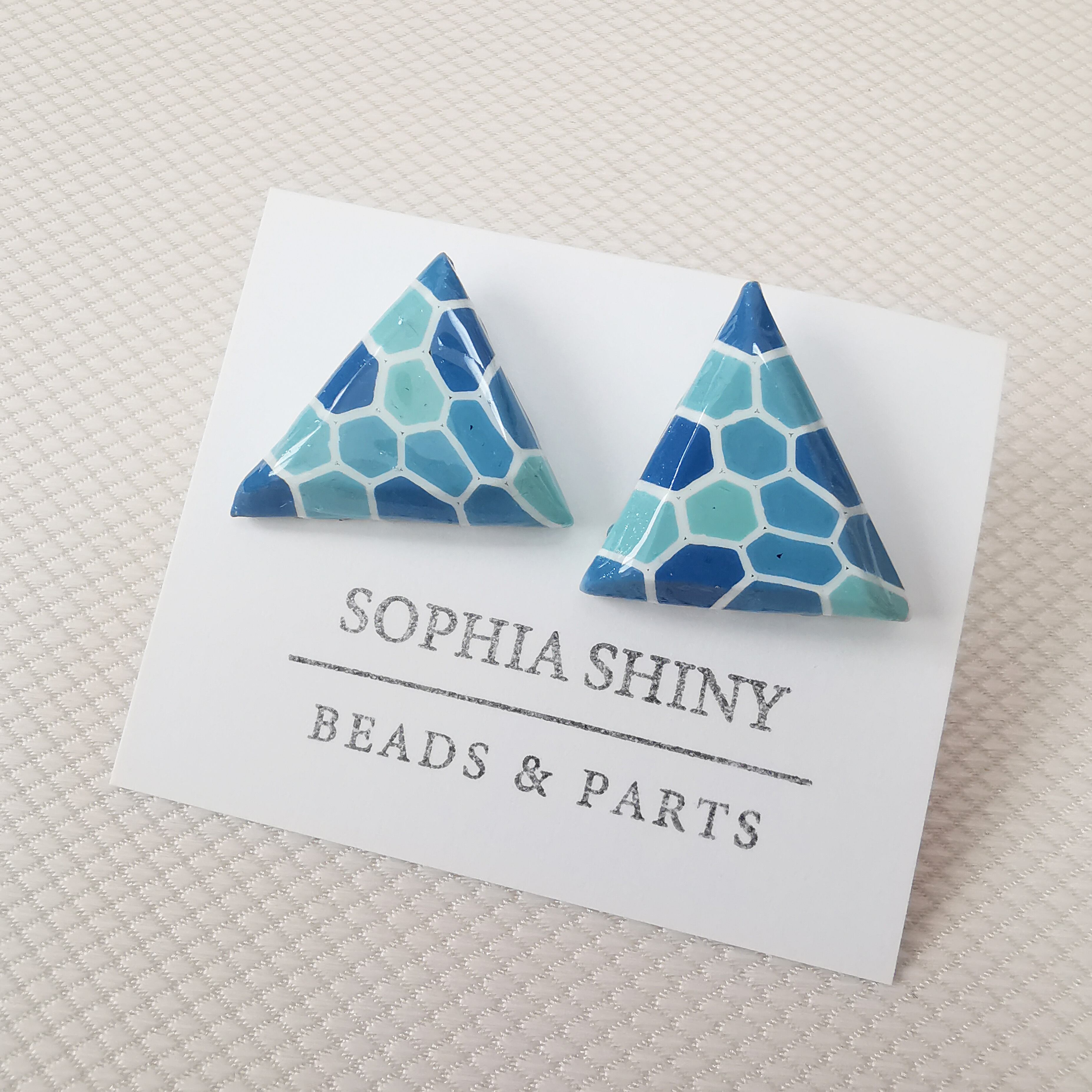 爽やかなパステルブルーの三角形タイル模様が特徴のポリマークレイピアスです。